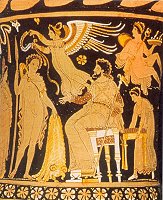Geschrei seiner Kinder gewarnt, eilte Iason zu ihrem Haus und fand sie dort in
